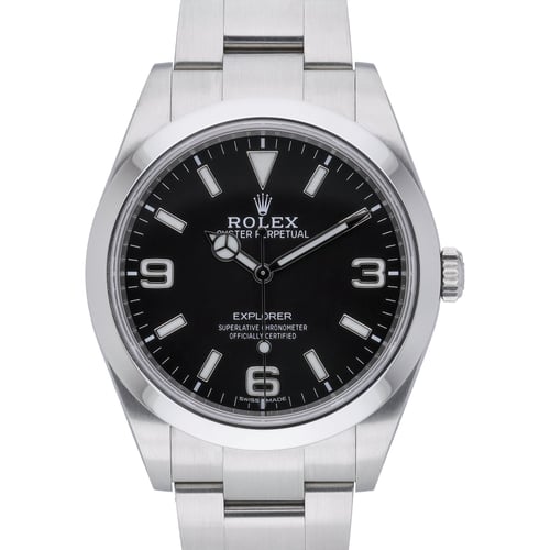 Discover the Rolex Explorer 214270 (BQ Ref 52974), a 2017 example in excellent condition that balances rugged capability with refined simplicity. Its 39mm Oystersteel case with plain bezel frames a crisp black Arabic dial under sapphire crystal, powered by a reliable automatic movement. The robust Oyster bracelet with Oystersteel links and secure Oysterlock clasp ensures comfort and confidence, while 100M water resistance makes it a versatile daily companion. Supplied with original box, original papers, and the original white tag, this timepiece is backed by our 2 Year Warranty for added assurance. Enjoy a 14 Day Return Policy and Next Day Delivery for a seamless purchase experience.