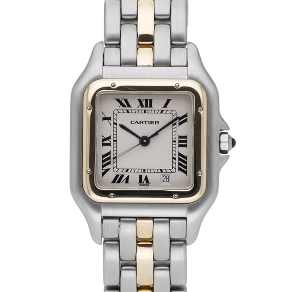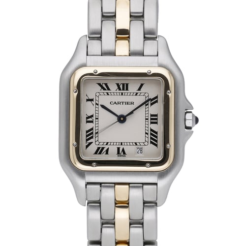 Cartier Panthère Cougar (Model 1100), a refined midsize 27mm two‑tone classic in steel and yellow gold. This elegant 1998 example features a crisp white Roman dial beneath durable mineral glass, a plain bezel, and a seamless concealed clasp on the matching bracelet. Powered by a reliable quartz movement and water resistant to 100M, it’s tailored for effortless everyday sophistication. Presented in excellent condition and supplied with its original Cartier box and papers, BQ Ref 52988. Enjoy peace of mind with our 2 Year Warranty, a 14 Day Return Policy, and Next Day Delivery.