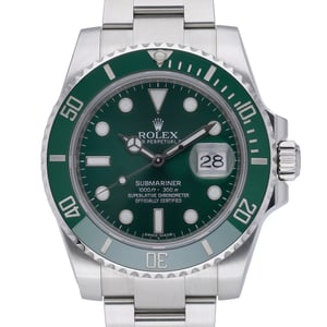 Rolex Submariner “Hulk” 116610LV, BQ Ref 53000. Crafted in durable Oystersteel with a 40mm case, this 2015 gents model showcases a striking green dial and matching unidirectional rotatable bezel. Powered by an automatic movement and protected by sapphire crystal, it offers professional performance with 300m water resistance. The classic Oyster bracelet with Oysterlock clasp ensures secure, comfortable wear. Presented in excellent condition, this example is complete with original Rolex box, papers, and green tag. Backed by a 2-year warranty, it is available with next day delivery and a 14-day return policy.
