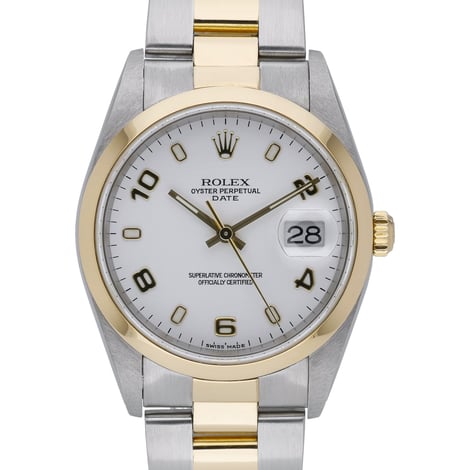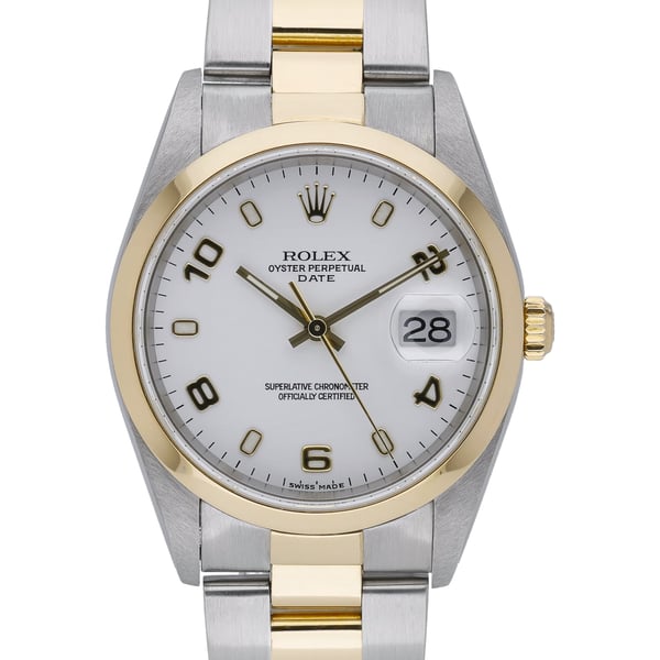 Timeless and refined, this Rolex Date (ref. 15203) showcases a 34mm steel and yellow gold Oyster case with a plain bezel and a crisp white Arabic dial beneath sapphire crystal. Powered by a dependable automatic movement, it features a two-tone Oyster bracelet with Oysterclasp for enduring comfort and security. Water resistant to 100M, this 2004 gents model is presented in excellent condition and supplied with its Rolex box. BQ Ref 52880. Enjoy peace of mind with our 2 Year Warranty, Next Day Delivery, and 14 Day Return Policy.