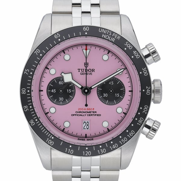 TUDOR Black Bay Chrono (Model 79360N) – a 41mm steel chronograph that fuses dive-ready durability with racing-inspired precision. This 2025 gents’ example is in excellent condition and showcases a striking pink chronograph dial beneath sapphire crystal, framed by a tachymetric bezel. Powered by an automatic movement and water resistant to 200M, it comes on a robust steel bracelet with a secure folding clasp. Supplied with original box, papers, and white tag, plus a 5-year manufacturer’s warranty from the date of manufacture (2025). Enjoy next day delivery and our 14-day return policy for added confidence. BQ Ref: 52875.