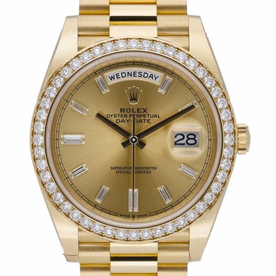Presenting the Rolex Day‑Date 40, ref. 228348RBR (BQ Ref 52879), a 2022 example in excellent condition. Crafted in 18ct yellow gold with a 40mm case, it features a diamond-set bezel and a champagne dial with baguette diamond hour markers, all protected by sapphire crystal. The iconic President bracelet in matching 18ct yellow gold with a concealed clasp delivers signature comfort and elegance, while the automatic movement ensures dependable precision. Water resistant to 100M, this Day‑Date balances luxury and everyday practicality. Supplied with its box, original papers, and white tag. Includes a 2 Year Warranty, 14 Day Return Policy, and Next Day Delivery. An enduring statement piece from Rolex’s most prestigious line.