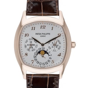 The Patek Philippe Perpetual Calendar 5940R-001 (BQ Ref: 52854) is an exquisite 37mm gentleman’s timepiece crafted in 18ct rose gold. It features a beautifully balanced white dial displaying Patek Philippe’s signature perpetual calendar complication, all protected beneath a durable sapphire crystal and framed by a refined plain bezel.