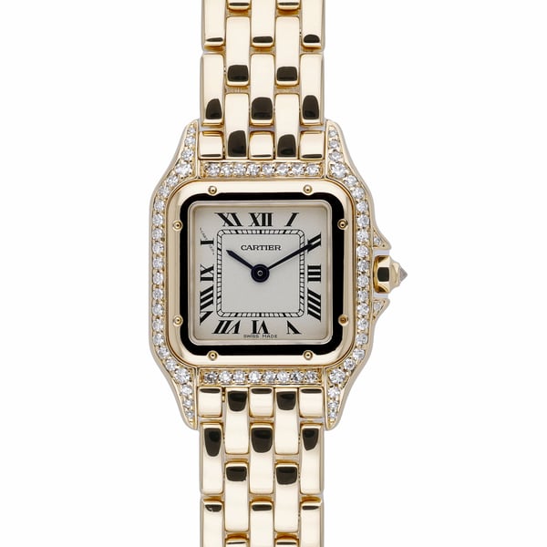 Elegantly timeless, the Cartier Panthère Ruban (Model 03546, BQ Ref 52891) captures the Maison’s iconic style in 18ct yellow gold. This ladies’ 22mm classic features a diamond-set bezel framing a white Roman dial protected by sapphire crystal, paired with the distinctive Ruban bracelet and secure folding clasp. Powered by a precise quartz movement and crafted in 1996, it is offered in excellent condition and comes with its box. Water resistant to 3 ATM, it’s refined for everyday elegance while remaining effortlessly wearable. Enjoy peace of mind with our 2 Year Warranty, Next Day Delivery, and a 14 Day Return Policy.