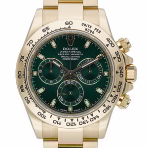 Presenting the Rolex Daytona 116508 (BQ Ref 52863), a coveted 40mm chronograph in solid 18ct yellow gold. Its striking green dial with chronograph registers is framed by a tachymetric bezel for precise timing, while the automatic movement delivers renowned Rolex reliability. The watch features a robust Oyster bracelet with secure Oysterlock clasp, sapphire crystal, and 100M water resistance for confident daily wear. Manufactured in 2018 and in excellent condition, this example is supplied with its original Rolex box, original papers, and white tag. Offered with a 2-year warranty, plus the reassurance of our 14-day return policy and next-day delivery. A standout reference that blends performance and prestige, ready to join any discerning collection.