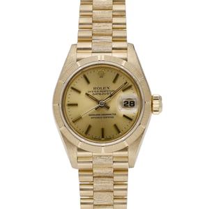 Rolex Datejust 69278 (BQ Ref 53087) — a refined ladies’ 26mm timepiece in solid 18ct yellow gold. Crafted in 1991 and retained in original condition, it features a distinctive bark-finished bezel, a champagne baton dial beneath sapphire crystal, and an automatic movement for effortless daily wear. The iconic President bracelet in matching 18ct yellow gold is secured by a concealed clasp for a seamless silhouette. Water resistant to 100M, this elegant Datejust is supplied with its Rolex box, original papers, and green tag. Offered with a 2 Year Warranty, Next Day Delivery, and a 14 Day Return Policy. A timeless expression of Rolex craftsmanship and discreet luxury.