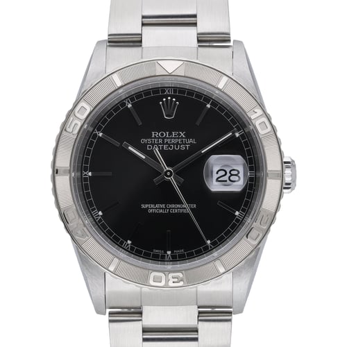 Rolex Datejust Turn‑O‑Graph ref. 16264 pairs the iconic Datejust versatility with a functional rotating Turn‑O‑Graph bezel for effortless timing. This 36mm Oystersteel example from 2003 features a sleek black baton dial beneath scratch‑resistant sapphire crystal, fitted to the robust Oyster bracelet with folding clasp. Powered by a reliable automatic movement and water resistant to 100m, it’s a refined everyday companion with sporty utility. Presented in excellent condition with original box and papers, BQ Ref 53022 is supplied with our 2 Year Warranty, Next Day Delivery, and a 14 Day Return Policy for complete peace of mind.