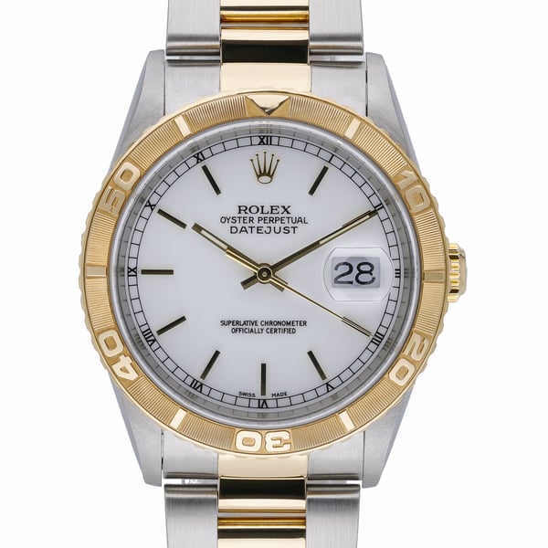 Elevate your collection with the Rolex Datejust Turn-O-Graph ref. 16263, a 36mm steel and yellow gold classic from 2000 in excellent condition. The signature rotating Turn-O-Graph bezel frames a crisp white baton dial beneath durable sapphire crystal, while the automatic movement ensures dependable precision. Finished with a two-tone Oyster bracelet and secure folding clasp, this versatile piece blends sporty functionality with timeless elegance and is water resistant to 100M. Supplied with its Rolex box and original papers. BQ Ref: 53016. Enjoy peace of mind with our 2-year warranty, a 14-day return policy, and next day delivery.