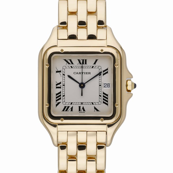 An icon of effortless elegance, this Cartier Panthère (Model 106000M, BQ Ref 53027) pairs timeless design with everyday versatility. Crafted in 18ct yellow gold, the 29mm case and matching linked bracelet frame a classic white Roman dial beneath scratch‑resistant sapphire crystal, complemented by a plain bezel and secure folding clasp. Powered by a precise quartz movement and water resistant to 30M, this gents model from 1991 is presented in excellent condition and comes complete with its Cartier box. Enjoy peace of mind with our 2 Year Warranty, plus the convenience of Next Day Delivery and a 14 Day Return Policy. A definitive statement of Cartier refinement, the Panthère’s fluid silhouette and enduring style make it a superb addition to any collection.
