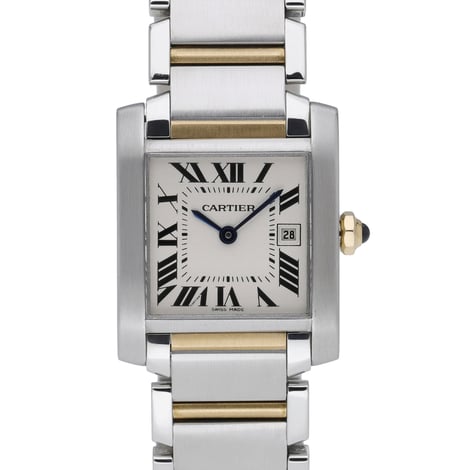 Timeless and refined, this midsize Cartier Tank Française (Model 2465) embodies the elegance of the iconic Tank design. Presented in excellent condition, it features a 25mm steel and yellow gold case with a matching bracelet and a plain bezel. The crisp white dial with classic Roman numerals sits beneath durable sapphire crystal, while a precise quartz movement ensures effortless reliability. Practical details include a secure folding clasp and 30M water resistance. Year of manufacture: 2007. Supplied with Cartier box and covered by our 2 Year Warranty, this watch is ready for immediate enjoyment. BQ Ref: 53067. Enjoy next day delivery and a 14 Day Return Policy for complete peace of mind.
