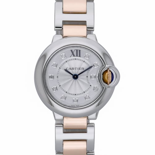 Cartier Ballon Bleu, Model 3009, in 28mm Steel & Rose Gold, blends signature elegance with everyday versatility. This ladies’ timepiece features a silver dial adorned with diamond hour markers beneath a scratch‑resistant sapphire crystal and a smooth plain bezel. Powered by a precise quartz movement, it is fitted with a two-tone Steel & Rose Gold bracelet and a secure folding clasp. Produced in 2012 and presented in excellent condition (BQ Ref 53068), it is supplied with a Cartier box and backed by a 2 Year Warranty. Water resistant to 30M. Enjoy Next Day Delivery and a 14 Day Return Policy for complete peace of mind.