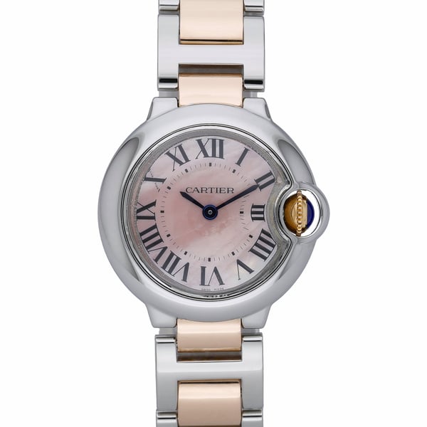 Elegant and timeless, this ladies’ Cartier Ballon Bleu (Model 3009, BQ Ref 53090) pairs polished steel with warm rose gold across its 28mm case and bracelet. The iconic rounded profile and plain bezel frame a pink mother-of-pearl dial with Roman numerals, protected by sapphire crystal. Powered by a precise quartz movement and secured with a folding clasp, it offers everyday practicality with 30M water resistance. Manufactured in 2017 and presented in excellent condition, this watch is supplied with its original Cartier box and papers and includes a 2 Year Warranty. Enjoy peace of mind with our 14 Day Return Policy and the convenience of Next Day Delivery.