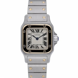 An icon of elegance, this ladies’ Cartier Santos (model 1567) pairs steel and yellow gold across its 24mm case and matching bracelet, framed by a plain bezel. The crisp white Roman dial sits beneath scratch-resistant sapphire crystal and is powered by a reliable quartz movement. Presented in excellent condition and dating to 1995, it secures with a folding clasp and offers practical 3ATM water resistance. Supplied with its box, and backed by a 2-year warranty, 14-day return policy, and next-day delivery. BQ Ref: 53012.