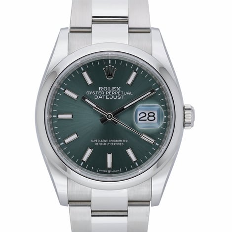 Presenting the Rolex Datejust 36 (Ref. 126200), a contemporary take on an icon. Crafted in corrosion-resistant Oystersteel, this 36mm model features a smooth bezel and a striking green baton dial protected by scratch-resistant sapphire crystal. Powered by a precise automatic movement and secured on the robust Oyster bracelet with a folding clasp, it offers everyday versatility and 10 ATM water resistance. This New/Unworn 2026 example arrives complete with Rolex box, original papers, and white tag (BQ Ref 53167). Covered by a 5-year manufacturer’s warranty from the date of manufacture, it delivers enduring confidence alongside timeless style. Enjoy next day delivery and our 14-day return policy.