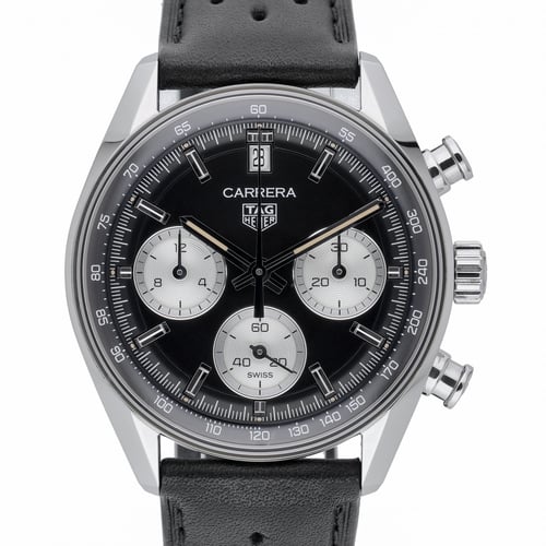 The TAG Heuer Carrera Chronograph (Model CBS2210-0) pairs modern performance with timeless style. Featuring a 39mm stainless steel case, black chronograph dial, and plain bezel under a scratch‑resistant sapphire crystal, it’s powered by an automatic movement for precision you can rely on. Water resistant to 100M, this 2025 gents model is presented on a supple leather bracelet with a secure folding clasp. In excellent condition, it comes complete with its original box and papers, plus a 2-year warranty for added peace of mind. A refined all‑rounder that transitions effortlessly from desk to weekend. BQ Ref: 53215. Enjoy next day delivery and a 14-day return policy.