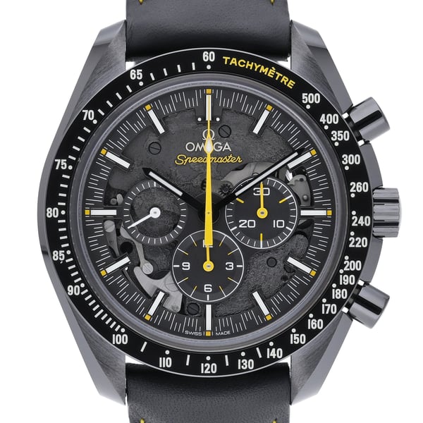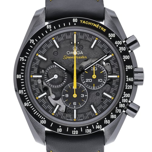 Discover the Omega Speedmaster Dark Side of the Moon (Ref. 311.92.44.30.01.001), a bold tribute to an icon. Its 44.2mm black ceramic case and matching tachymeter bezel frame a deep black chronograph dial protected by sapphire crystal. A manual-wind movement powers the stopwatch functions with traditional precision, while a supple black leather strap and pin buckle ensure secure, comfortable wear. Water resistant to 5 ATM, this New/Unworn 2019 example arrives complete with its box and original papers. Backed by our 2 Year Warranty, it also benefits from Next Day Delivery and a 14 Day Return Policy for complete peace of mind. BQ Ref: 53220.