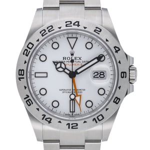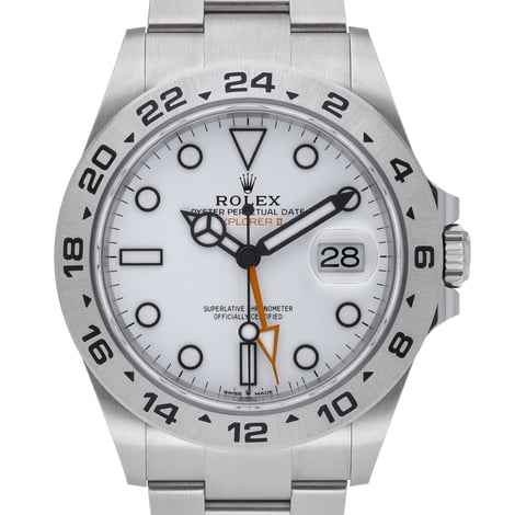 Discover the Rolex Explorer II, reference 226570, a 42mm tool watch in resilient Oystersteel with a crisp white dial and a fixed 24-hour graduated bezel for assured legibility around the clock. This New/Unworn 2026 example features an automatic movement, scratch-resistant sapphire crystal, and 100m water resistance, paired with the robust Oyster bracelet and secure Oysterlock clasp. Supplied as a complete set with Rolex box, original papers, and white tag (BQ Ref 53205). Enjoy peace of mind with a 5-year manufacturer’s warranty from the 2026 date of manufacture, alongside our 14 Day Return Policy. In stock for Next Day Delivery.