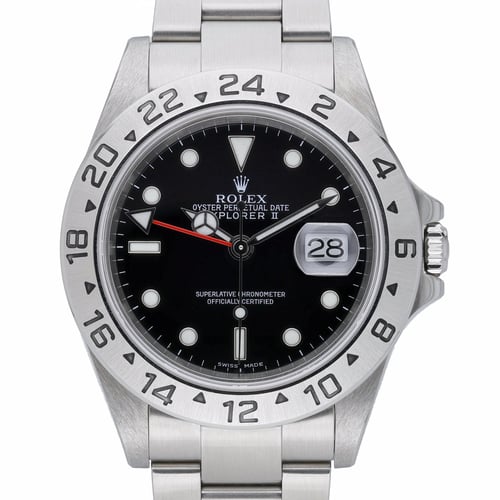 Discover the Rolex Explorer II ref. 16570, a 40mm Oystersteel tool watch that balances rugged capability with refined style. This 2004 example is in excellent condition, featuring a black dial protected by scratch-resistant sapphire crystal, a fixed 24-hour graduated bezel, and Rolex’s reliable automatic movement. The Oyster bracelet with Oysterlock clasp offers secure, all-day comfort, while 100m water resistance makes it ready for everyday adventure. Supplied complete with original Rolex box, papers, and green tag, it’s a standout choice for both collectors and daily wearers. Backed by our 2 Year Warranty, Next Day Delivery, and 14 Day Return Policy. BQ Ref 53284.