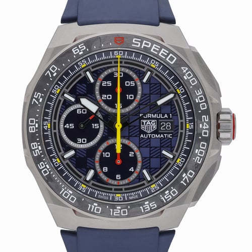 Celebrate precision engineering with the TAG Heuer Formula 1 x Oracle Red Bull Racing Chronograph (CBZ2080). This 44mm titanium timepiece features a blue chronograph dial protected by sapphire crystal and a tachymetric-scale bezel for rapid speed calculations. Powered by an automatic movement and water-resistant to 200M, it blends racing pedigree with everyday durability. A comfortable rubber strap with a pin buckle completes the sport-focused design. Year of manufacture 2026; presented in excellent condition and supplied with original box and papers. BQ Ref 53269. Next Day Delivery available, with a 14 Day Return Policy for complete peace of mind.