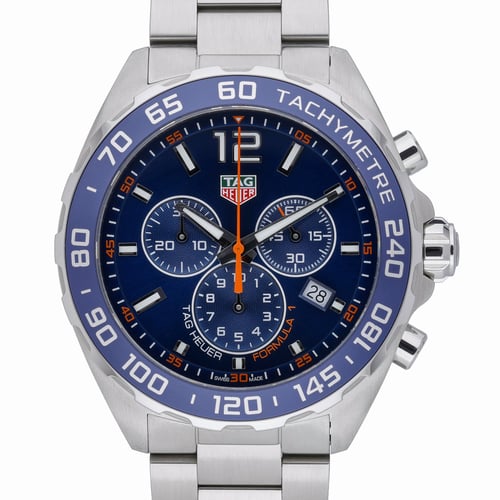 Embodying racing DNA with everyday versatility, this Tag Heuer Formula 1 (Model CAZ1014) is a 43mm gents chronograph in excellent condition. The robust steel case and bracelet with secure folding clasp frame a striking blue dial with chronograph layout, set beneath scratch‑resistant sapphire crystal and complemented by a tachymetric scale bezel. Precision is assured by a reliable quartz movement, while 200M water resistance enhances its sport-ready credentials. Year of manufacture: 2022. Supplied with original box and papers, and covered by a 2 Year Warranty. Benefits include Next Day Delivery and a 14 Day Return Policy. BQ Ref: 53340.
