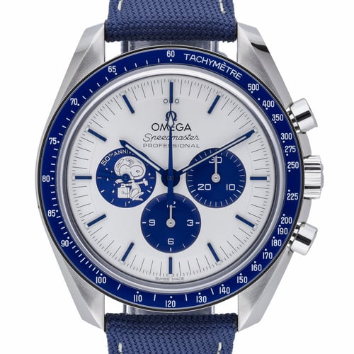 Celebrate Omega’s lunar legacy with the Speedmaster Snoopy, BQ Ref 53343 (Model 310.32.42.50.02.001). This new/unworn 2026 release features a 42mm stainless steel case with tachymetric bezel, a refined silver chronograph dial, and scratch‑resistant sapphire crystal. True to Speedmaster tradition, it’s powered by a manual-wind movement and paired with a comfortable fabric strap secured by a pin buckle. Water resistant to 5 ATM, it blends everyday versatility with iconic mission heritage. Supplied with Omega box and original papers, and backed by a 5-year manufacturer’s warranty from the date of manufacture (2026). Enjoy Next Day Delivery and a 14 Day Return Policy for complete peace of mind.