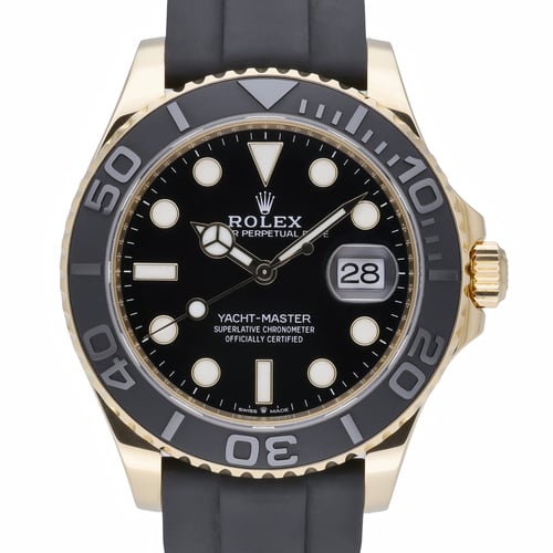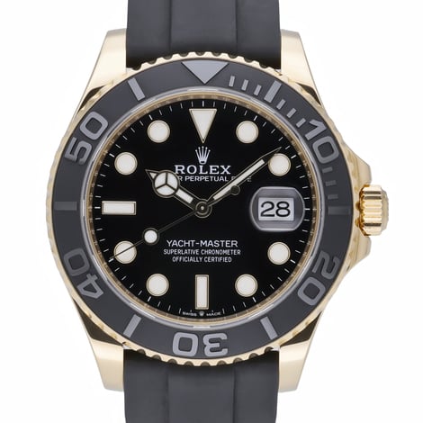 Rolex Yacht-Master 42 (Ref. 226658), 2023. Crafted in 18ct yellow gold and paired with the high-performance Oysterflex rubber bracelet, this gents’ timepiece presents a commanding 42mm case, black dial, and scratch-resistant sapphire crystal. Its bidirectional rotatable bezel and automatic movement deliver precise, effortless timekeeping, while 100m water resistance and a secure folding clasp ensure reliable everyday wear. In excellent condition and supplied with original Rolex box and papers, this watch is covered by the 5-year manufacturer’s warranty from the date of manufacture (2023). Enjoy confidence with our 14-day return policy and the convenience of next day delivery. BQ Ref: 53368.