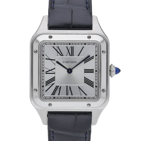 Refined and unmistakably Cartier, this Santos Dumont (BQ Ref. 53391) blends timeless elegance with everyday practicality. Crafted in 2025, it features a 43.5mm steel case with a plain bezel and a silver dial accented by classic Roman numerals. The ultra-reliable quartz movement ensures precise timekeeping, while the leather strap with pin buckle offers understated comfort and style. Water resistant to 30M, this example is in excellent condition and arrives complete with its original box and papers. Enjoy added peace of mind with a 2 Year Warranty, plus our 14 Day Return Policy and Next Day Delivery for a seamless purchase experience. A refined statement piece from Cartier, the Santos Dumont remains an icon of clean lines and enduring sophistication.