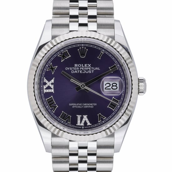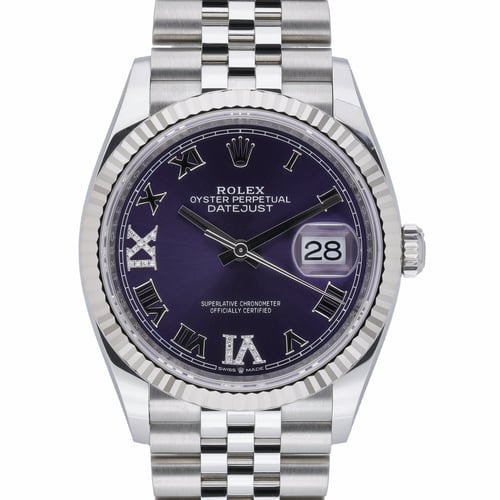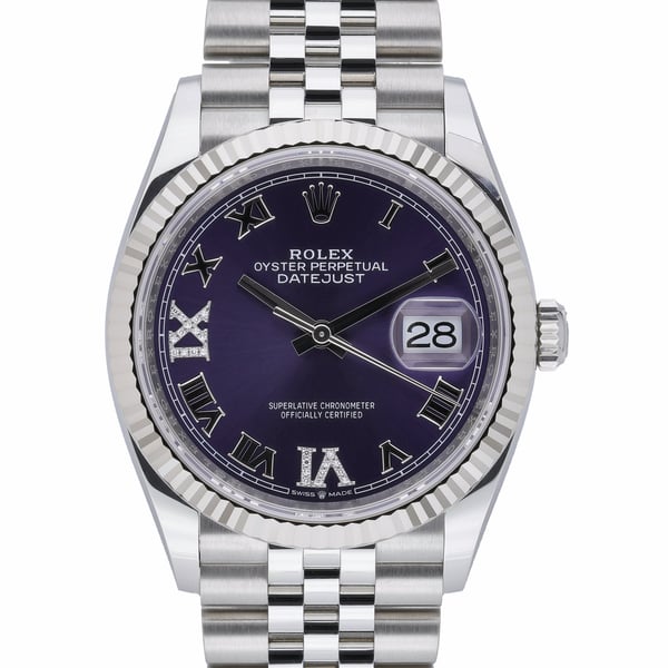 Presenting the Rolex Datejust 36, Ref. 126234 (BQ Ref. 53488)—a 2023 Rolesor creation in steel and white gold with the iconic fluted bezel. Its 36mm case frames an aubergine dial set with diamonds and Roman numerals, protected by scratch-resistant sapphire crystal. Driven by an automatic movement and paired with a Jubilee bracelet in Oystersteel and a secure folding clasp, it delivers refined comfort and everyday versatility with 100M water resistance. This watch is in excellent condition and comes complete with original box, original papers, and white tag. Covered by the Rolex 5-year manufacturer’s warranty from the 2023 date of manufacture, it offers enduring peace of mind. Enjoy Next Day Delivery and a 14 Day Return Policy for a seamless purchase.